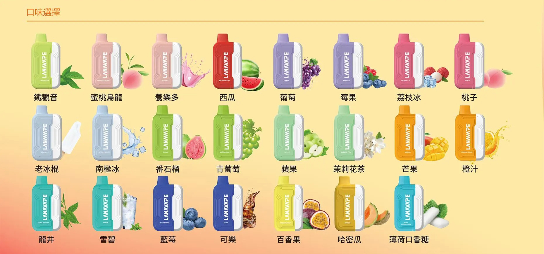| 口味 | 鐵觀音, 蜜桃烏龍, 養樂多, 西瓜, 葡萄, 莓果, 荔枝冰, 桃子, 龍井, 雪碧, 藍莓, 可樂, 老冰棍, 南極冰, 番石榴, 青葡萄, 蘋果, 茉莉花茶, 芒果, 橙汁, 薄荷口香糖, 百香果, 哈密瓜, 主機 |
