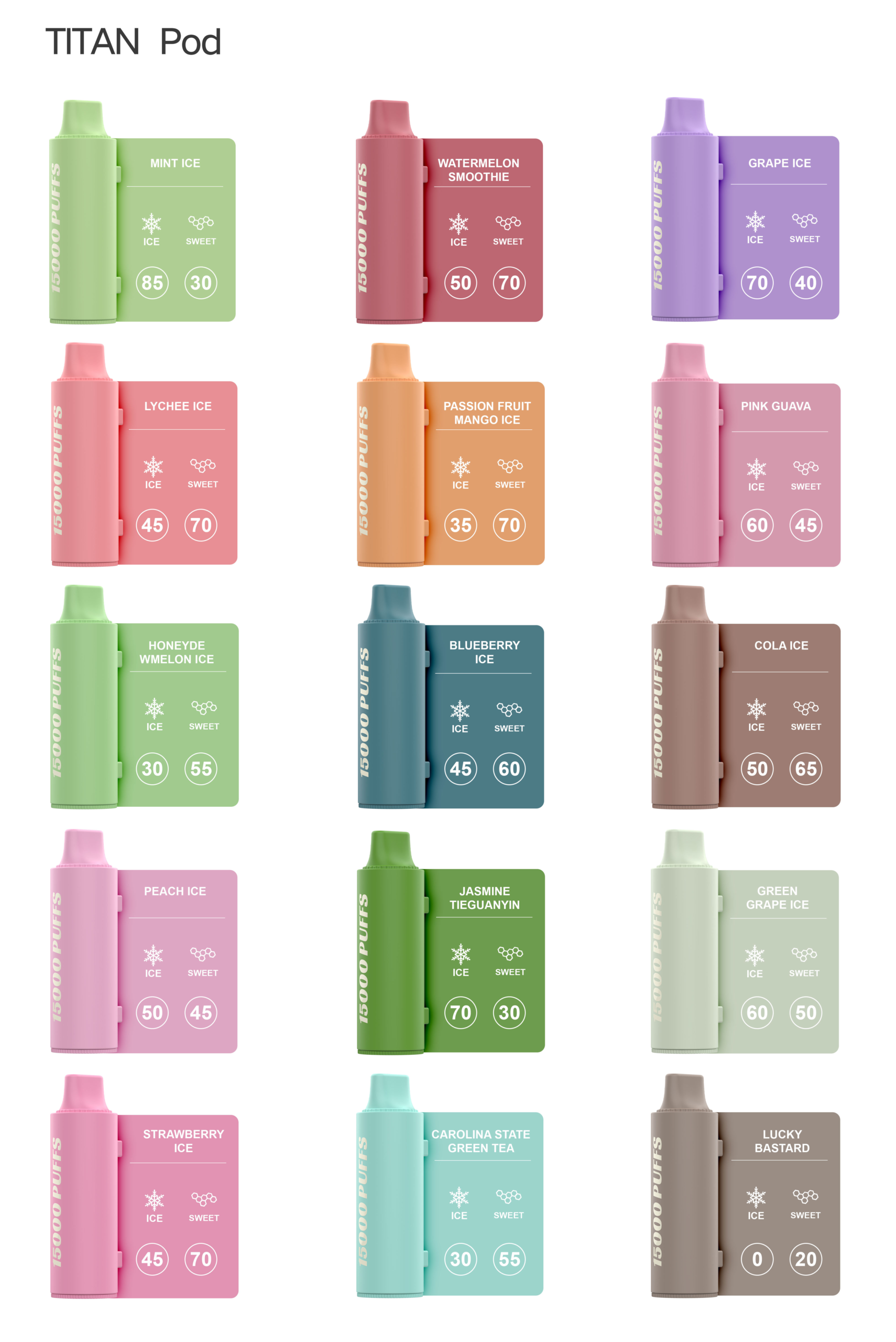 | 口味 | 綠茶, 煙草, 樹莓櫻桃可樂, 茉莉鐵觀音, 蜜瓜奶凍, 粉紅芭樂, 青提奶冰, 山竹荔枝, 水蜜桃汁, 三重薄荷, 冰藍漿果, 西瓜冰沙, 多肉葡萄, 香草草莓, 百香果芒芒, 天藍主機, 淺咖主機, 米黃主機, 淺紫主機, 米白主機 |